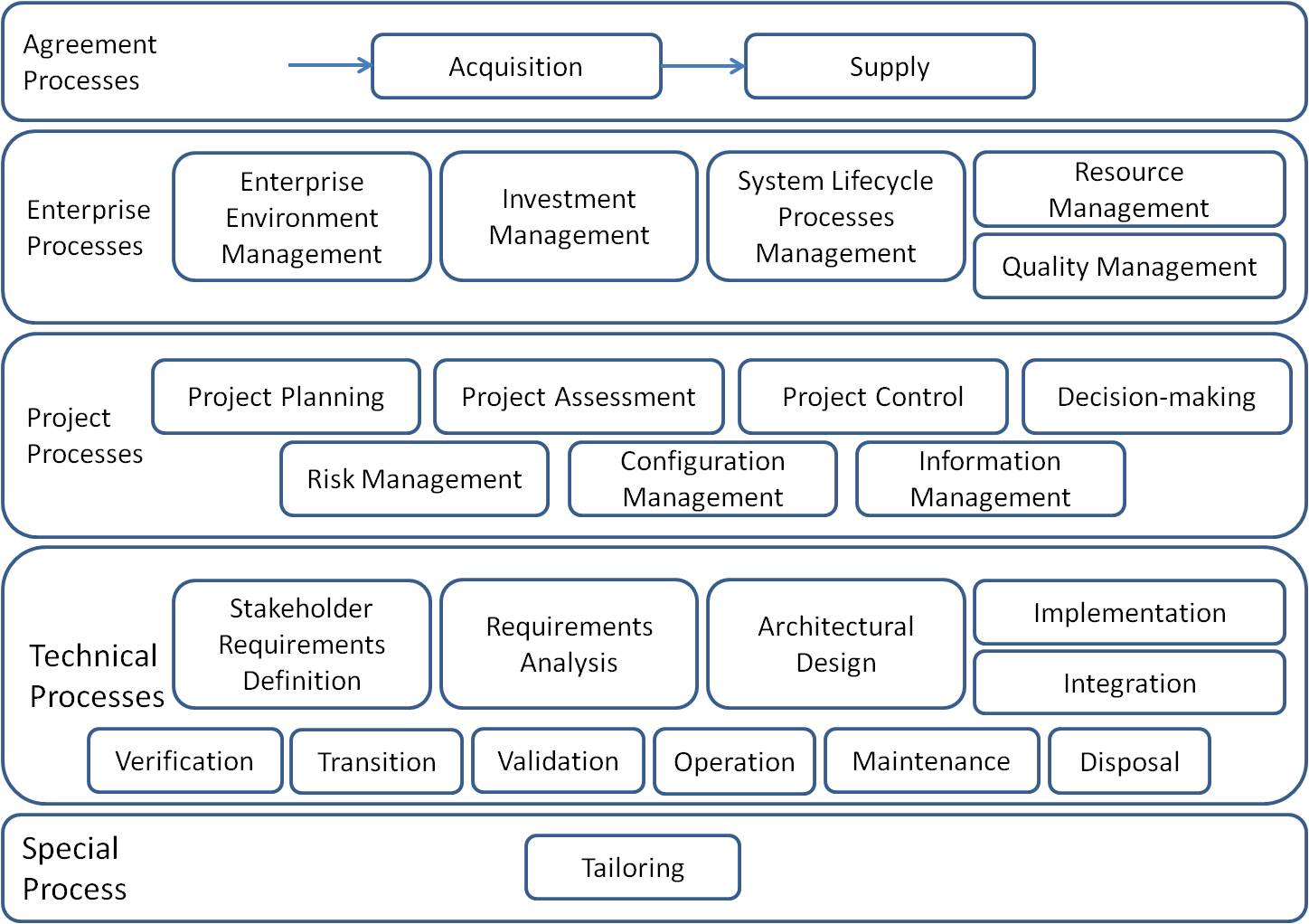 System Lifecycle Processes I processi definiti dalla norma ISO/IEC 15288 sono in numero superiore a quelli definiti nella ISO/IEC 12207. La figura che segue rappresenta lo schema dei processi della ISO/IEC 15288 divisi in 5 categorie: Agreement Processes, Enterprise Processes, Project Processes, Technical Processes e Special Processes.